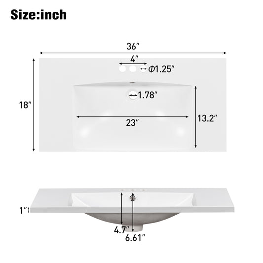36" Single Bathroom Basin Sink, Vanity Top Only, 3-Faucet Holes, Resin
