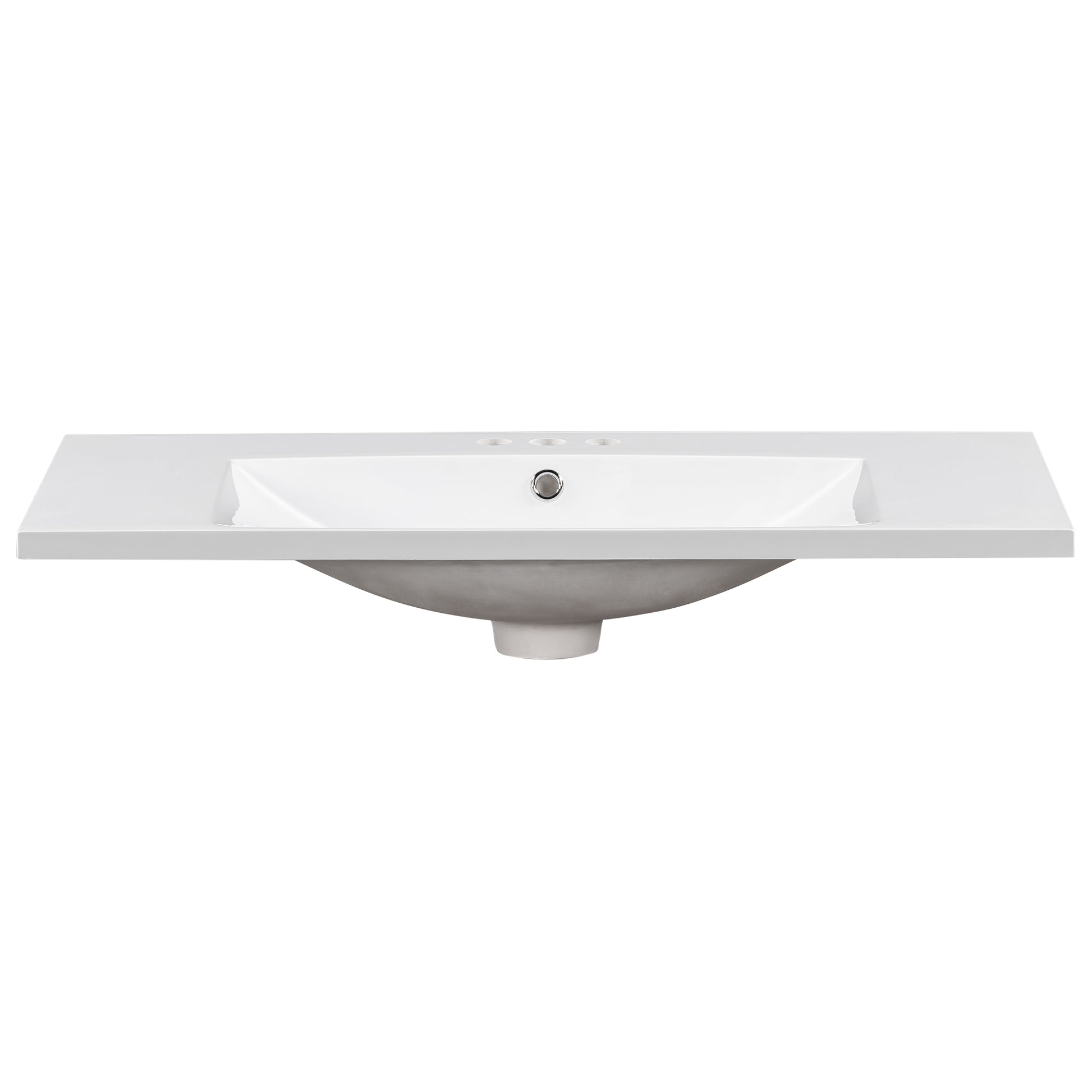 Dimensions: 36 inches (L) x 18 inches (W) x 6.61 inches (D) Material: Premium Resin Faucet Holes: 4-Inch Center Set, Three Holes Drain Opening: 1.78 inches